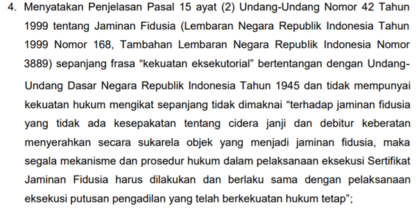 Poin 2 dan 4 amar putusan di atas adalah terkait Pasal 15 (2) UUJF dan penjelasannya. Pasal ini berisi ketentuan bahwa akta jaminan fidusia berisi kekuatan eksekutorial sama seperti putusan pengadilan. Dalam praktik, ditengarai kekuatan ini disalahpahami dan melahirkan tindakan semena-mena kreditur menarik barang jaminan lalu menjualnya sendiri. Hal ini terlihat dalam pertimbangan hakim berikut: